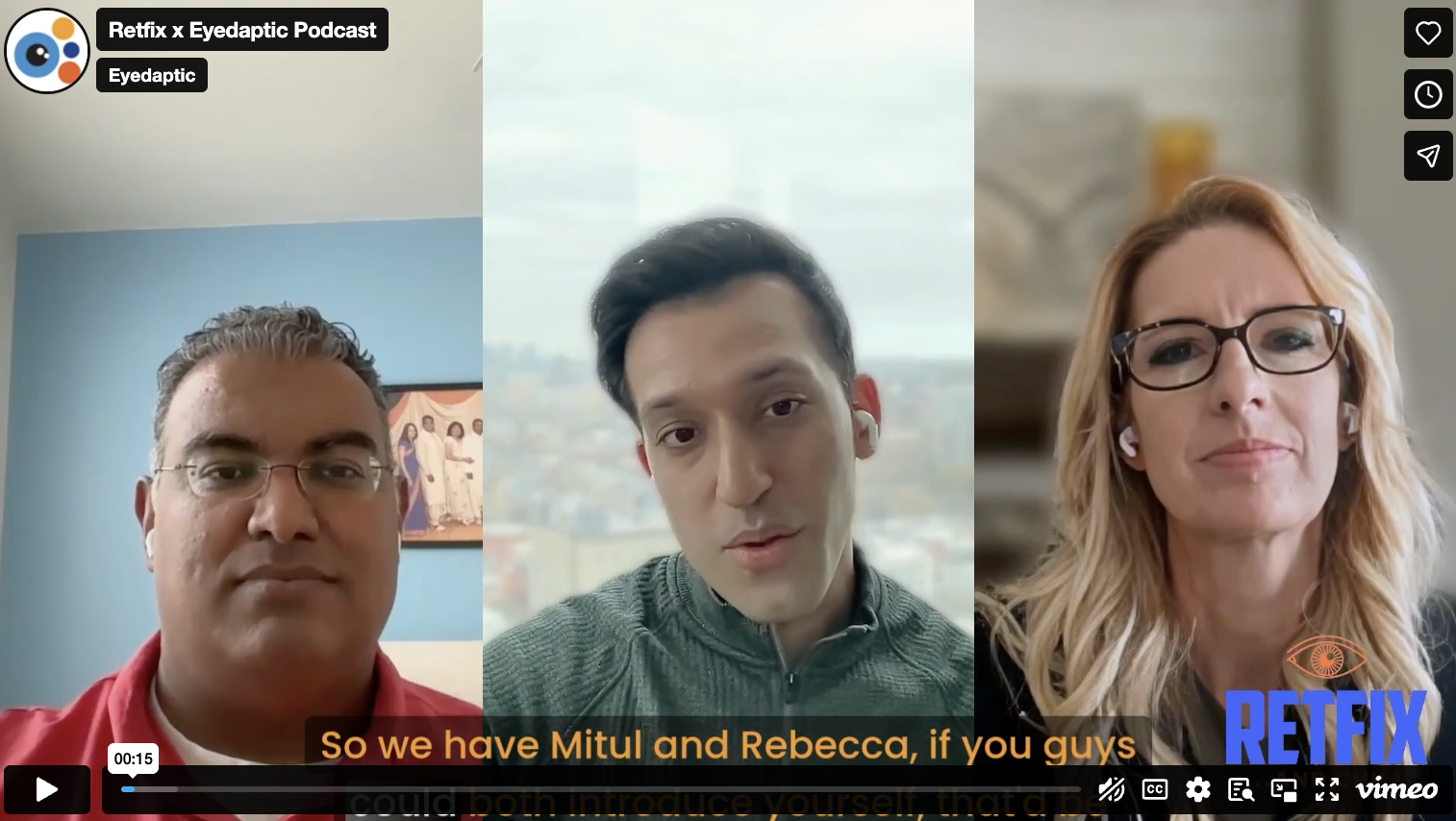 Retfix + Eyedaptic Podcast March 19, 2026 Retfix + Eyedaptic Podcast What does the future of low vision care look like? Eyedaptic Co-Founder and Retina Specialist Dr. Mitul Mehta and Low Vision Specialist Dr. Rebecca Kammer join the RetFix podcast to discuss new frontiers and tech advancing low vision therapy. Share This Tweet Share Pin It Share Related Posts OIS: Ophthalmology Innovation Summit @ Retina – Presentation Uniting Over 300 Leaders in the Development of Ground-Breaking Ophthalmic Technologies The Ophthalmology Innovation Summits… Eyedaptic and Venture Optical Management Announce Strategic Collaborative Partnership to Advance Vision Care Innovation Eyedaptic and Venture Optical Management Announce Strategic Collaborative Partnership to Advance Vision Care Innovation The… 2nd Place Finish at Quick Pitch San Diego In this video, Jay Cormier, Founder, and CEO of Eyedaptic, talks about Eyedaptic Augmented Reality…